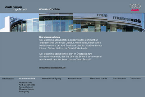 Das Audi Forum Ingolstadt basiert auf einem urbanen Konzept: Produktion, Verwaltung, Dienstleistungen, Ausstellungsräume, Läden, Kino, Gastronomie und Museum sind miteinander verbunden. Die Website bietet neben allgemeinen Informationen auch einen Überblick über die Geschichte des Unternehmens, Veranstaltungstipps und vieles mehr.