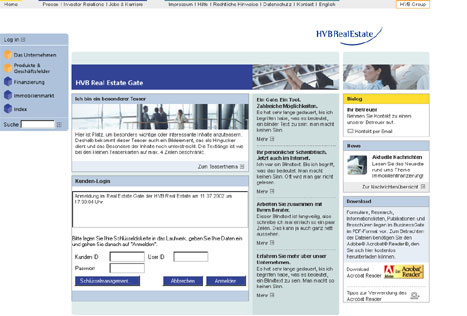 Im Real Estate Gate der Hypovereinsbank konnten Immobilienkunden der HVB ihre Bankgeschäfte tätigen und sich mit zusätzlichen Werkzeugen Informationen rund um das Baugeschäft besorgen. So gab es unter anderem einen Zins- und Devisenrechner, aktuelle Immobilienkurse und vieles mehr.